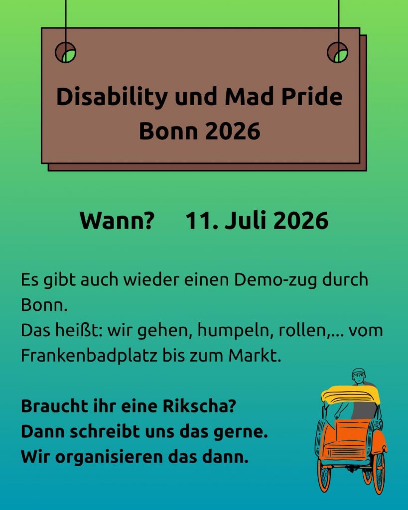 Oben steht ein großes braunes Schild: Disability und Mad Pride Bonn 2026